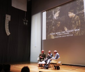 Mais là où Gilbert & George nous passionnent peut-être plus encore, c’est dans leur sens de la poésie ; une poésie où règnent l’enfance, le mystère, un sentiment d’inquiétante étrangeté dont témoignent parfaitement l’exposition « They Were Two Young Men ». Déjà présentée à Turin en 1971, cette « sculpture au fusain-sur-papier » resurgit pas loin de cinquante ans plus tard à la Fondation Louis Vuitton… comme par magie et non sans une certaine nostalgie. Douceur et méditation mélancolique émanent de ces larges dessins où deux jeunes hommes, costumés, pensent et devisent entourés d’arbres et de végétation. Il est question ici de racine, de protection mais aussi de foi dans l’avenir, ce que prouve bien d’ailleurs, plusieurs décennies plus tard, la présence côte à côte de ces artistes toujours amoureux et heureux de défendre des œuvres qui, avec eux, ont passé l’épreuve du temps.